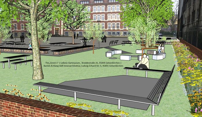 Seit 2021 entsteht auf dem Schulhof des Leibniz-Gymnasiums das „Grüne L“, eine grüne Oase. Neue Sitzmöglichkeiten, Bewegungsmöglichkeiten, Zier- und Nutzpflanzenbeete, grüne Klassenräume und sogar ein blauer Raum sollen hier entstehen. Ein Ort an dem Mensch und Natur zusammen kommen und ein Treffpunkt für Schüler und Nachbarn.