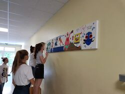 Heute ist der Wandfries des GK-Kunst der Stufe EF mit 12 Schülerinnen und neun Schülern, unterstützt von ihrer Kunstlehrerin Frau Pruß, fertiggestellt worden. Das Thema waren Comic-Figuren, die den schon vorhandenen Wandfries erweitert haben. Die einzelnen Kunstwerke gehen ineinander über und ergeben so ein lang gestrecktes, zusammenhängendes Bild. Die Schülerinnen und Schüler hängten Ihre Bilder selber auf.