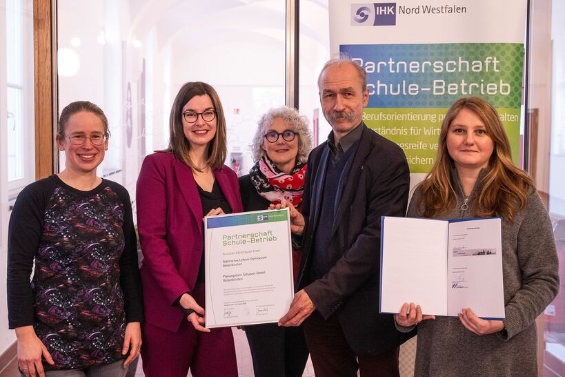 Das Städtische Leibniz-Gymnasium und die Planungsbüro Schubert GmbH in Gelsenkirchen besiegelten die 700. Kooperation im IHK-Projekt „Partnerschaft Schule-Betrieb“ (v.l.): Meike Winkelmann (Leibniz-Gymnasium), Daisy Schubert (Planungsbüro Schubert), Eva Hild (IHK) sowie Michael Scharnowski und Hanna Gruschka (beide Leibniz-Gymnasium).
