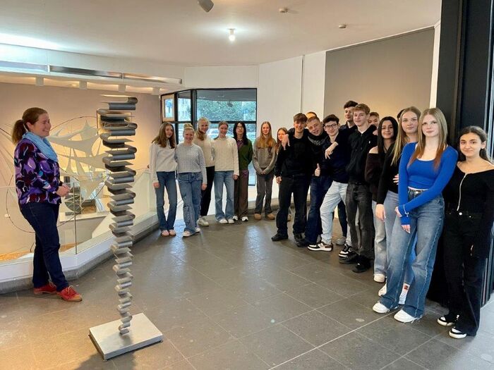 Die Schüler*innen aus den 10er Klassen haben mit Ihren Kunstlehrkräften (Frau Petershöfer, Frau Zovak, Herr Mancini-Ramirez und Frau Pruß) die Kinetische Sammlung des Kunstmuseums in der letzten Woche besucht. Sie haben schon vor Ort ein kleines Kunstwerk hergestellt und werden sich jetzt im Unterricht mit dem Thema Kinetik theoretisch und praktisch auseinandersetzen. Kinetische Kunst ist ein Objekt, welches sich bewegt, bewegt werden kann oder die Illusion von Bewegung erzeugt.