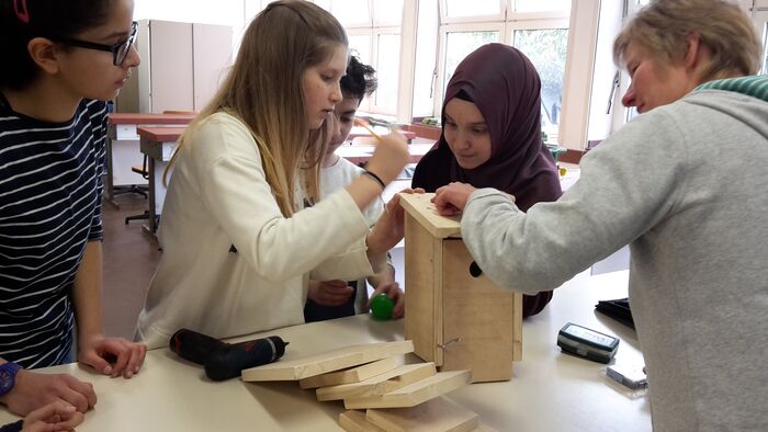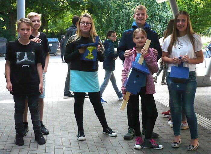 Seit geraumer Zeit finden sich auf unserem Schulgelände Vogelnistkästen, die die Biologie-AG, geleitet von Frau Baumann, durch Spendenaktionen finanziert und selbst gebaut hat. Dazu verkauften sie Vogelfutter und kauften von dem Erlös das Material für Nistkästen. Mit Akkuschrauber und Farbe wurden diese dann zusammengestellt.