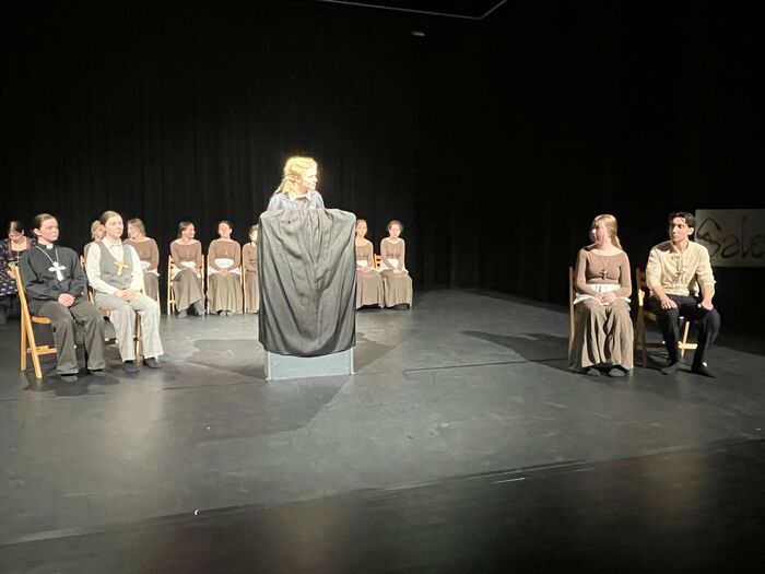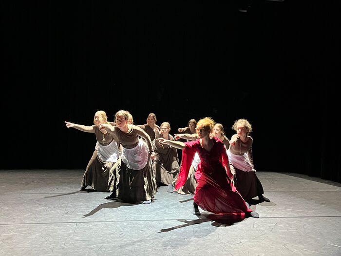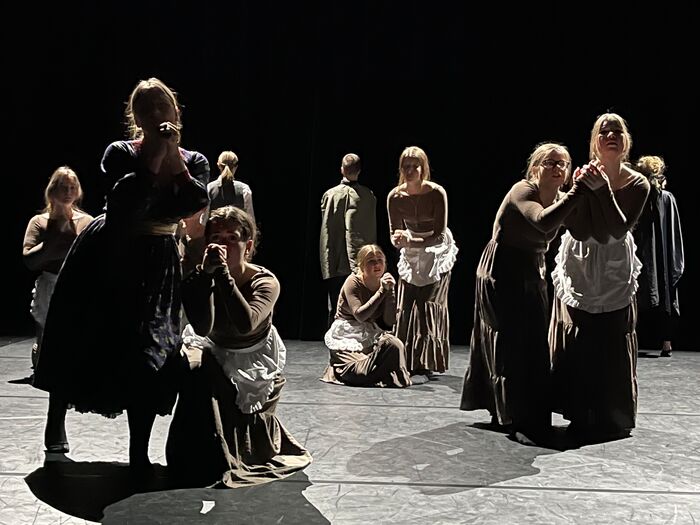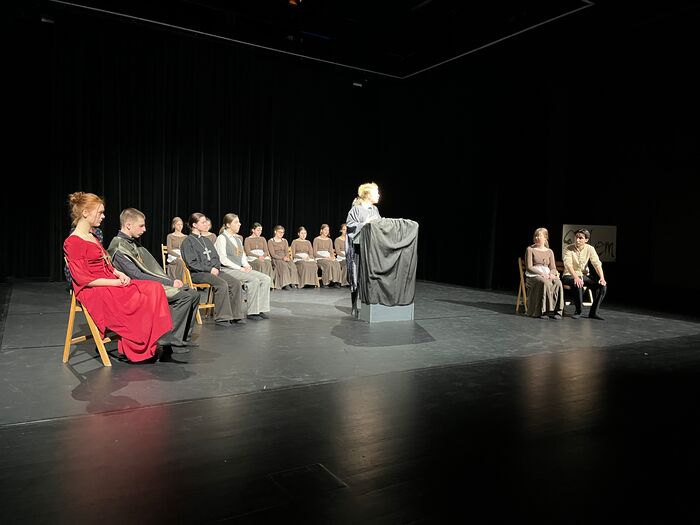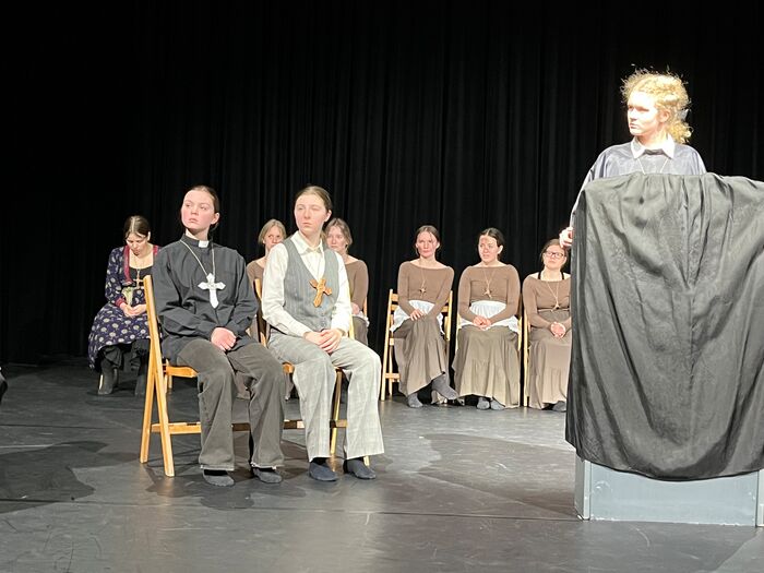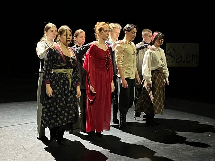 Wie gewohnt fand die Premiere von „The Crucible“ im Cottbuser Kinder- und Jugendtheater „Piccolo“ statt. Die Schülerinnen und Schüler des Leibniz-, Annette-von-Droste-Hülshoff- und Max-Planck-Gymnasiums machten sich am 14. Februar auf den Weg, um mit ihrem 95-minütigen Werk das Lausitzer Publikum zu gefangen zu nehmen. Unterstützt wurden sie dabei von Schulleiter Michael Scharnowski, der Choreografin Raffaela Naruhn und dem Musiker Leonard Mallman. Trotz der kurzen Vorbereitungszeit von nur viereinhalb Monaten – bedingt durch die Teilnahme am Theaterfestival „Intertwined“ im September des vergangenen Jahres – zeigten alle Ensemblemitglieder großes Engagement, Teamgeist und Leidenschaft. In Cottbus zahlte sich die harte Probenarbeit aus: Die Premiere am Montagabend war gut besucht, und die Zuschauer waren von der Inszenierung begeistert.