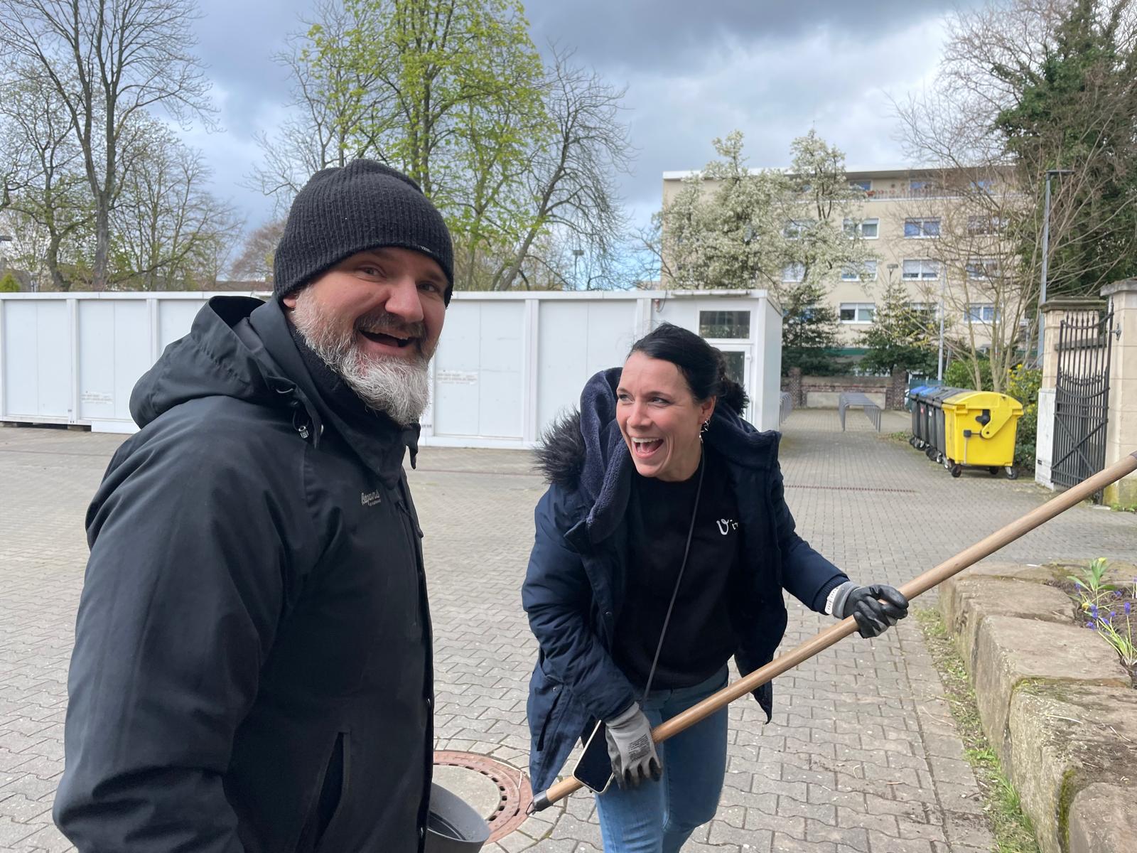 Im Zentrum der Aktion standen zwei große Beete, die eine Generalüberholung dringend nötig hatten. Mit vereinten Kräften wurden die Flächen umgegraben, von Unkraut befreit und die Erde aufgelockert. Im Anschluss wurden sie komplett neu bepflanzt, sodass wir uns jetzt schon über einen blühenden neuen Magnolienbaum und viele andere Büsche und Stauden freuen können, die im Laufe des Frühlings und Sommers hoffentlich gut angehen werden.