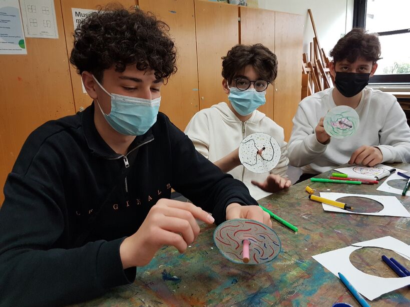 Die Schüler*innen aus den 9er Klassen haben mit Ihrer Lehrerin Frau Pruß die Kinetische Sammlung des Kunstmuseums in den letzten Wochen besucht. Sie haben schon vor Ort ein kleines Kunstwerk hergestellt und werden sich jetzt im Unterricht mit dem Thema Kinetik theoretisch und praktisch auseinandersetzen. Kinetische Kunst ist ein Objekt, welches sich bewegt, bewegt werden kann oder die Illusion von Bewegung erzeugt.
