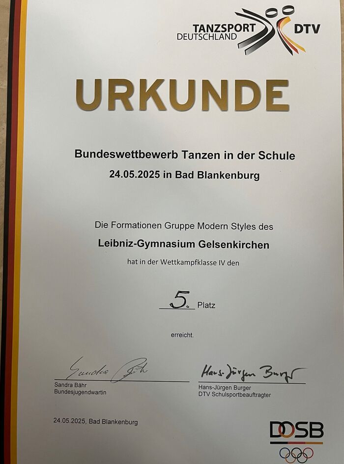 Wir gratulieren unserer Tanz-AG herzlich zu diesem beeindruckenden Ergebnis und danken Frau Steffentorweihen und Frau Pecher sowie Enise Okuyucu (10c), die diesen Erfolg möglich gemacht haben!