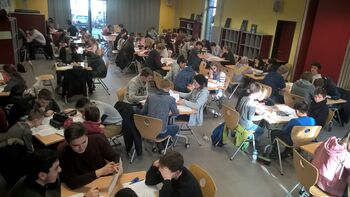 91 Schülerinnen und Schüler aus allen Jahrgangsstufen traten am Dienstag, 16.01.2018 in 26 Teams an. 14 spannende Knobelaufgaben mussten im Team mit maximal 4 Teilnehmern in 60 Minuten gelöst werden; die Köpfe rauchten, angestrengte, ehrgeizige und zielstrebige Diskussionen wurden leise und intensiv an den Gruppentischen im MZR geführt.
