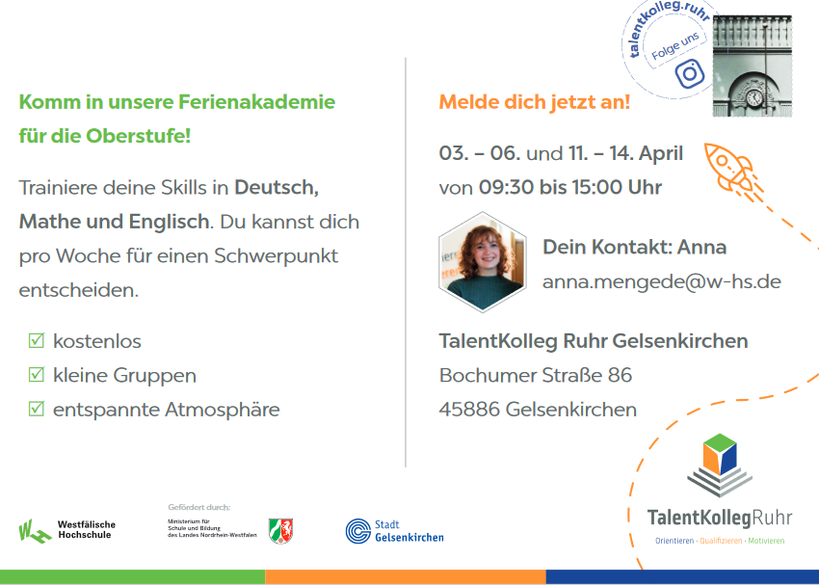 In den Osterferien bietet das Team des TalentKollegs Ruhr der Westfälischen Hochschule sowohl in Herne als auch in Gelsenkirchen ein Ferienprogramm für Talente an. Im Mittelpunkt der Osterferienakademie 2023 stehen die Kernfächer Mathematik, Englisch und Deutsch. Talente der 10. Klasse und der Oberstufe können die Ferienzeit nutzen, um in Kleingruppen Grundlagen zu wiederholen.