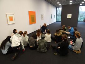 Dieses Haus ist vorrangig den Werken von Josef Albers gewidmet: zahlreiche Quadrate in unterschiedlichen Größen und Farben. Schaut man genau hin, findet man quadratische Formen auch in der Architektur von Gebäuden und an anderen Stellen im Stadtraum. Ausgestattet mit einem thematisch passenden Forschungsauftrag, suchten die Leibniz-Schülerinnen und -Schüler im Josef Albers Museum nach Quadraten im Innen- und Außenraum. Sie trugen ihre Beobachtungen zusammen und zeichneten architektonische Bauformen.