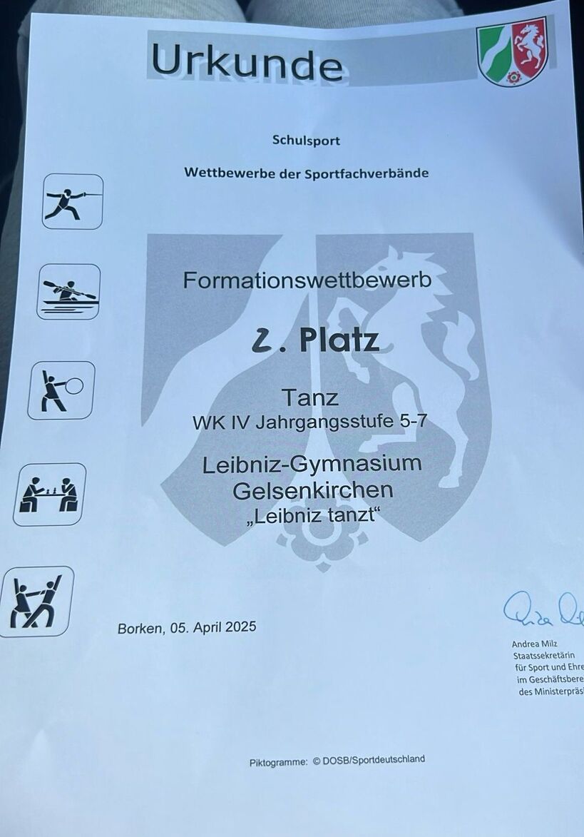 Ein großartiger Erfolg für die Tanz-AG „Leibniz tanzt“: Beim Landeswettbewerb Tanzende Schulen erreichte das Team des Leibniz-Gymnasiums Gelsenkirchen den 2. Platz von 19 teilnehmenden Gruppen – und sicherte sich damit die Qualifikation für den Bundeswettbewerb, der Ende Mai in Thüringen stattfinden wird!