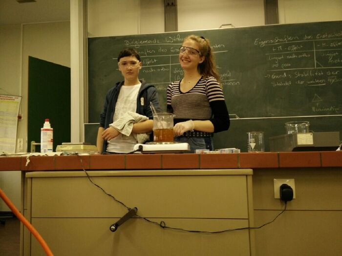 Sanela: „Das Arbeiten im Team war sehr motivierend, wir konnten entspannter experimentieren und vertieften durch unsere Gespräche über die Versuche unser Wissen. Dadurch kamen uns immer mehr Ideen. Faszinierend finden wir aber auch die Chemiesammlung, weil es hier immer etwas Neues zu entdecken gab. Auch, weil dies eigentlich ein für Schüler nicht befugter Bereich ist.“