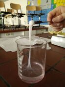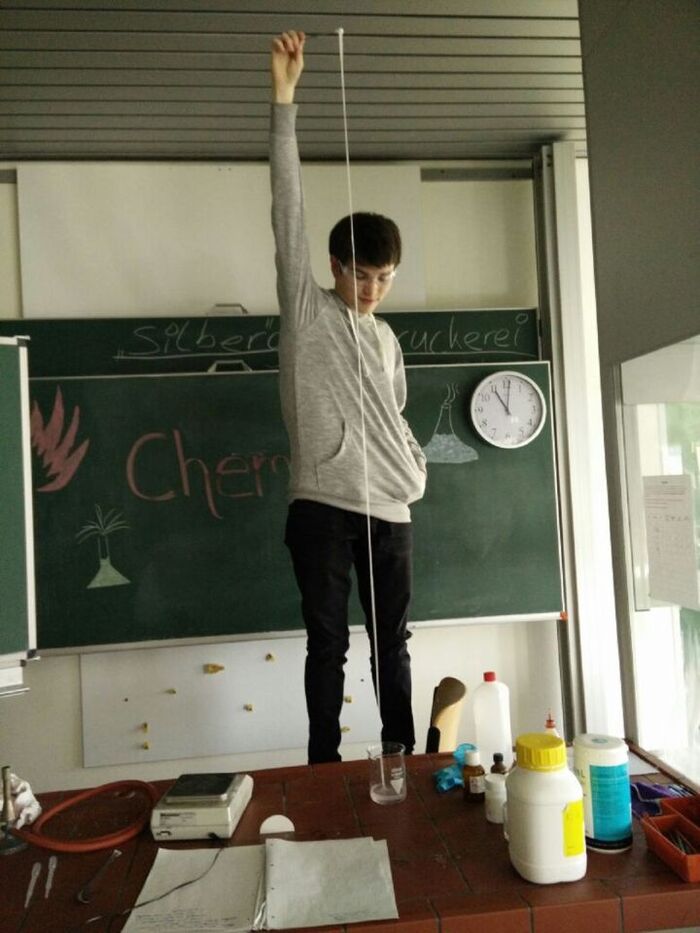 Auch dieses Jahr haben wir wieder motivierte Schüler/innen der Q1, die fleißig an ihren Facharbeiten experimentieren. Während in der einen Ecke Seife hergestellt wird, spinnt der nächste aus Sebacinsäuredichlorid und Hexamethylendiamin Nylonfäden und vergleicht diese mit Spinnenseide. Ein weiterer Schüler untersucht u.a. die Bestandteile verschiedener Benzinsorten seines Mopeds, um zu erklären, warum sein Tank so schnell rostet. Unter UV-Licht findet dagegen eine Schülerin den Täter diverser (Schul-)Delikte.