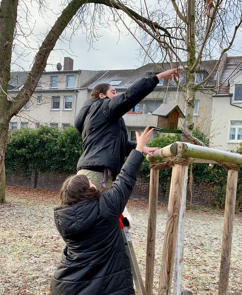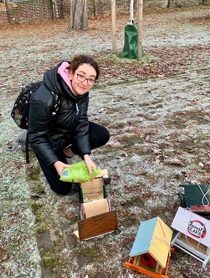 Die Häuser wurden zunächst bemalt. Nun sind sie befüllt mit Vogelfutter und auf dem Schulhof aufgehängt, um unsere heimischen Vögel in diesen frostigen Tagen zu unterstützen.