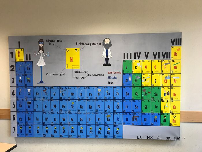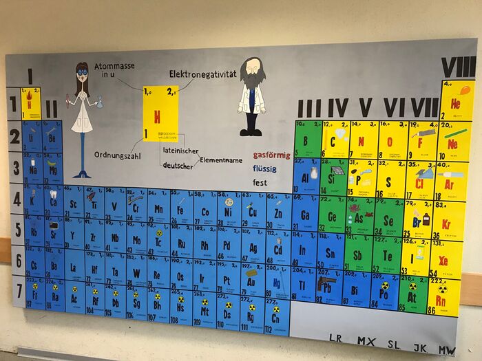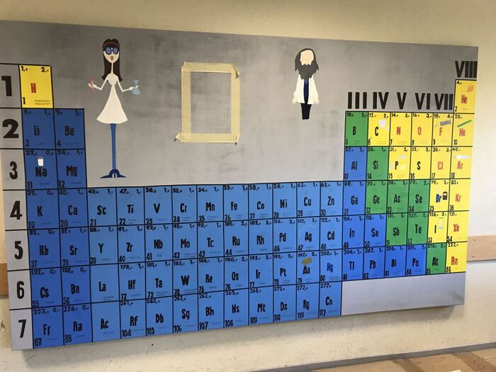Nach sehr langer harter Arbeit mit vielen kopfzerbrechenden Stunden über die exakte Planung und dann korrekten Zusammensetzung der einzelnen Bausteine (Elemente) und anschließenden stundenlangen akribischem Malen haben wir es nun endlich geschafft. Das "neue" von Hand gemalte Periodensystem ist endlich einsatzbereit.