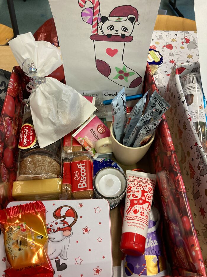 Es wurde von den Schülerinnen und Schülern eifrig gebastelt, gedichtet, gebacken, dekoriert, gemalt und eingekauft. Das Ergebnis kann sich sehen lassen und es sind so kreativ gestaltete und liebevoll gefüllte Kartons entstanden, u.a. mit selbst gebackenen Keksen und selbst gebrannten Mandeln, geschriebenen Gedichten, Bildern, Tee, Kosmetik etc.