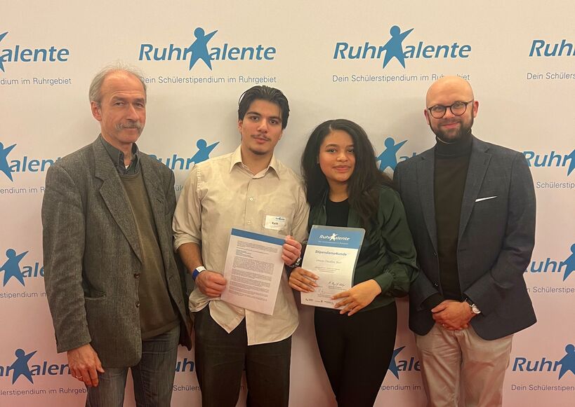 Im festlichen Rahmen der diesjährigen RuhrTalente-Jahresgala wurden auch die Leibniz-Schüler*innenUrsula „Ulla“ Buri und Eyüb Arduc (beide Q1) mit einem Stipendium bedacht. Sie gehören zum Jahrgang 2023 der RuhrTalente, die in das Stipendienprogramm aufgenommen wurden. Begleitet wurden die beiden von ihren Familien und Freund*innen sowie von Schulleiter Michael Scharnowski und Sascha Ludwig, Ullas ehemaligen Philosophielehrer, der sie der Auswahlkommission für das Stipendium empfahl.