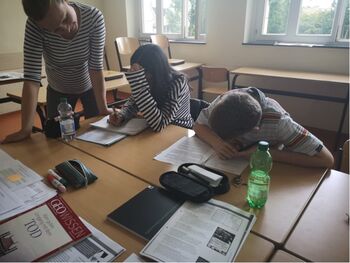Uns fiel sofort auf, dass es sehr ruhig war und an den Tischen nur zwei Schüler*innen saßen. Herr Podjaski sagte, dass es ein sehr ernstes Thema sei und sich deshalb nur wenige angemeldet hätten.